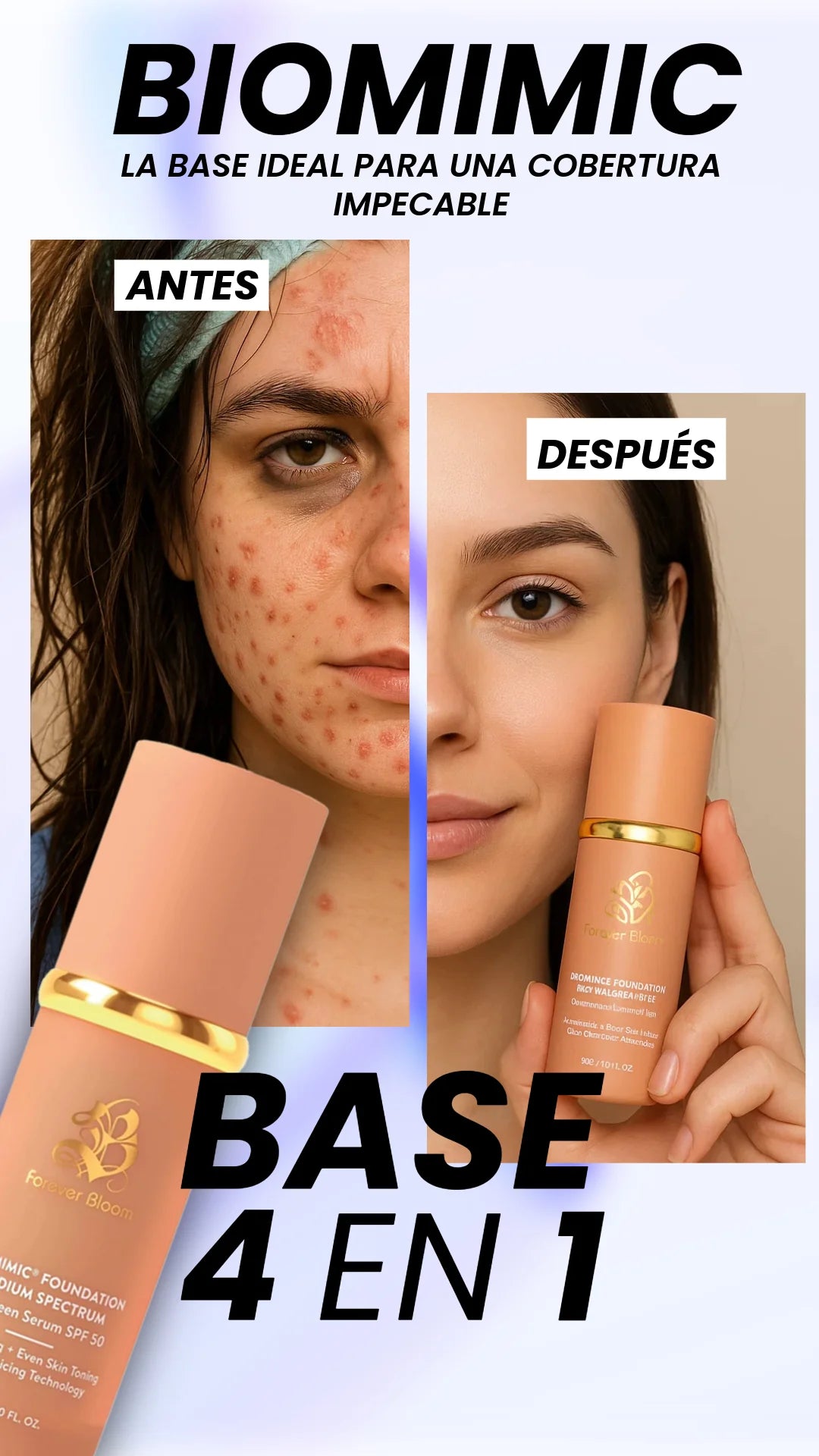 Olvídate de las imperfecciones con nuestra base revolucionaria. En solo 5 minutos, BIOMIMIC TLM®️ ajusta su tono automáticamente a tu piel, ofreciendo un acabado natural y radiante que te acompaña todo el día.